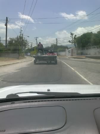 A scene from Kingston’s streets yesterday: it is difficult to see, but I had to get a shot of this young man riding on the back of a POLICE jet-ski in transit on the back of a flatbed truck. I hope he made it to his destination safety. He was definitely enjoying the ride.