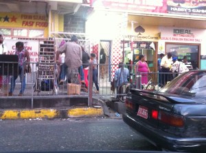 Since entering journalism school some years ago and acquiring a manual, non-digital camera, one of my favourite things to do is walk around and take pictures. Whether it is a bustling downtown core or my own neighborhood, I love walking for hours and capturing those moments of life we might otherwise overlook. I had a feeling I wouldn’t be able to do this in Kingston and I was right. It is not really safe and many people seem to take offense at a “foreigner” taking their picture (although many don’t, I must say). So I have yet to take a camera down to the madness that is HalfWay Tree or downtown, especially the street of clothes on Princess Street, where vendors have obliterated the overhead skyline by stringing clothes above the roadway, from one store to another like a laundry line. The colors, the life, the millions of exchanges are beautiful madness. Perhaps one day I will gather the courage or find a suitable person to accompany me. For now, I must be satisfied with using my iPhone from the car window, which takes surprisingly good pictures. Here is HalfWay Tree about mid-day. It really never settles down there, the characters just change, from the people selling clothes and books and food, to the “loaders” putting people on coasters, to the young men selling drugs or soliciting gold, to the people passing through. The only hours I have not witnessed what it is like there is from about 2am to 4:30am. I imagine it is quieter then, but some transactions must still occur, probably more of the illegal kind.