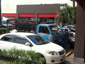 The other day I was at a mall in uptown Kingston and my friend pointed to something. I looked and just saw a parking lot full of cars. Then, I realized what she was talking about as I focused on this one truck, full of cows and goats (the goats are crammed up behind the cows’ backsides, poor things)! It seems the drivers had stopped at the bank to do some business. The cows and goats seemed content, as did the small crowd that had gathered around to take pictures.